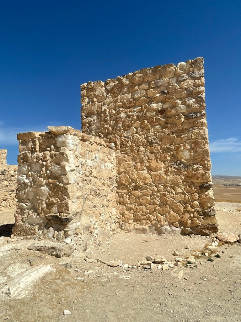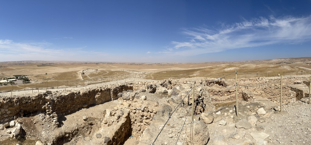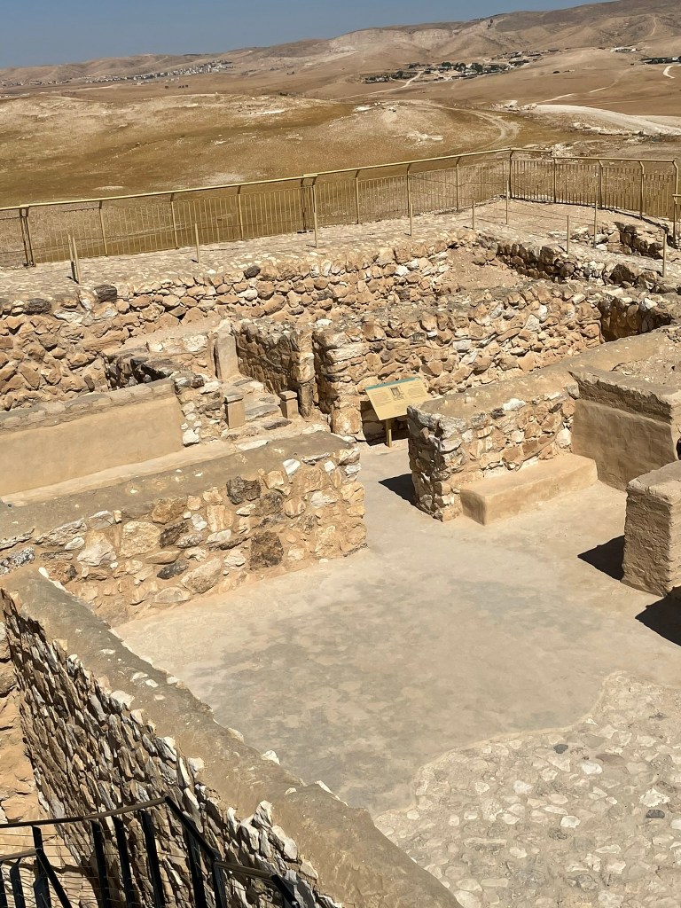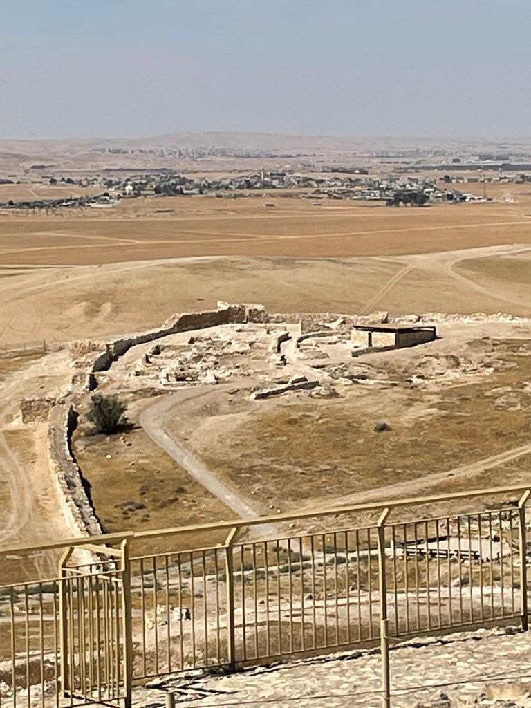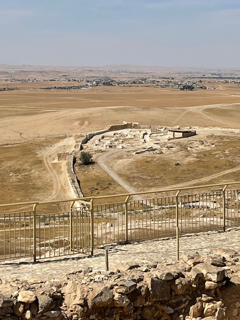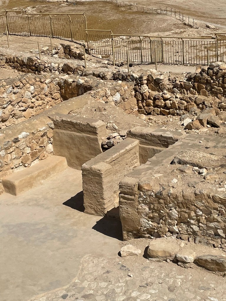 We started in Beersheva and then made our way to the east to Tel Arad, which is located in the eastern Negev. Its location is strategically located on the route which led to both Sinai and Transjordan. Tel Arad was the site of a Canaanite city from the early Bronze Age. The city was a as large as 10 hectares at its peak. The Israelites occupied the site during the Iron Age, building a fortress on the northern portion of the city. Within the fortress, the excavators found a Judahite temple (a cultic site) with two standing stones and two incense altars. The fortress and the lower city both have water systems to collect rain water run off.